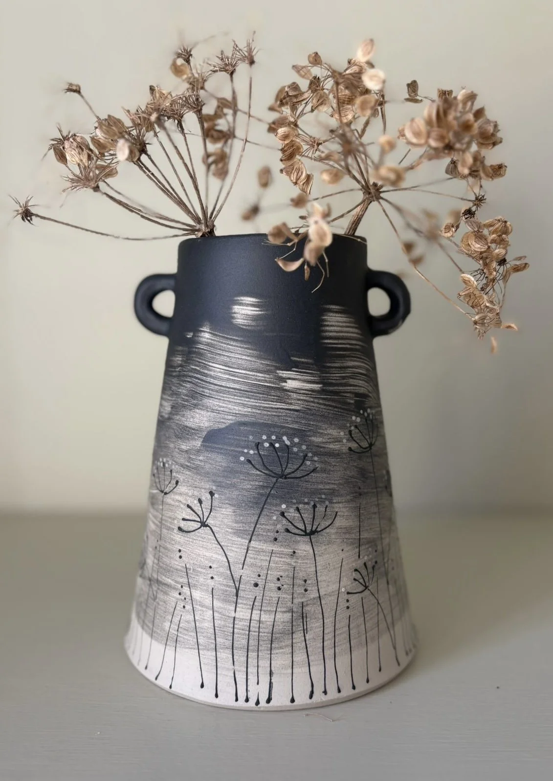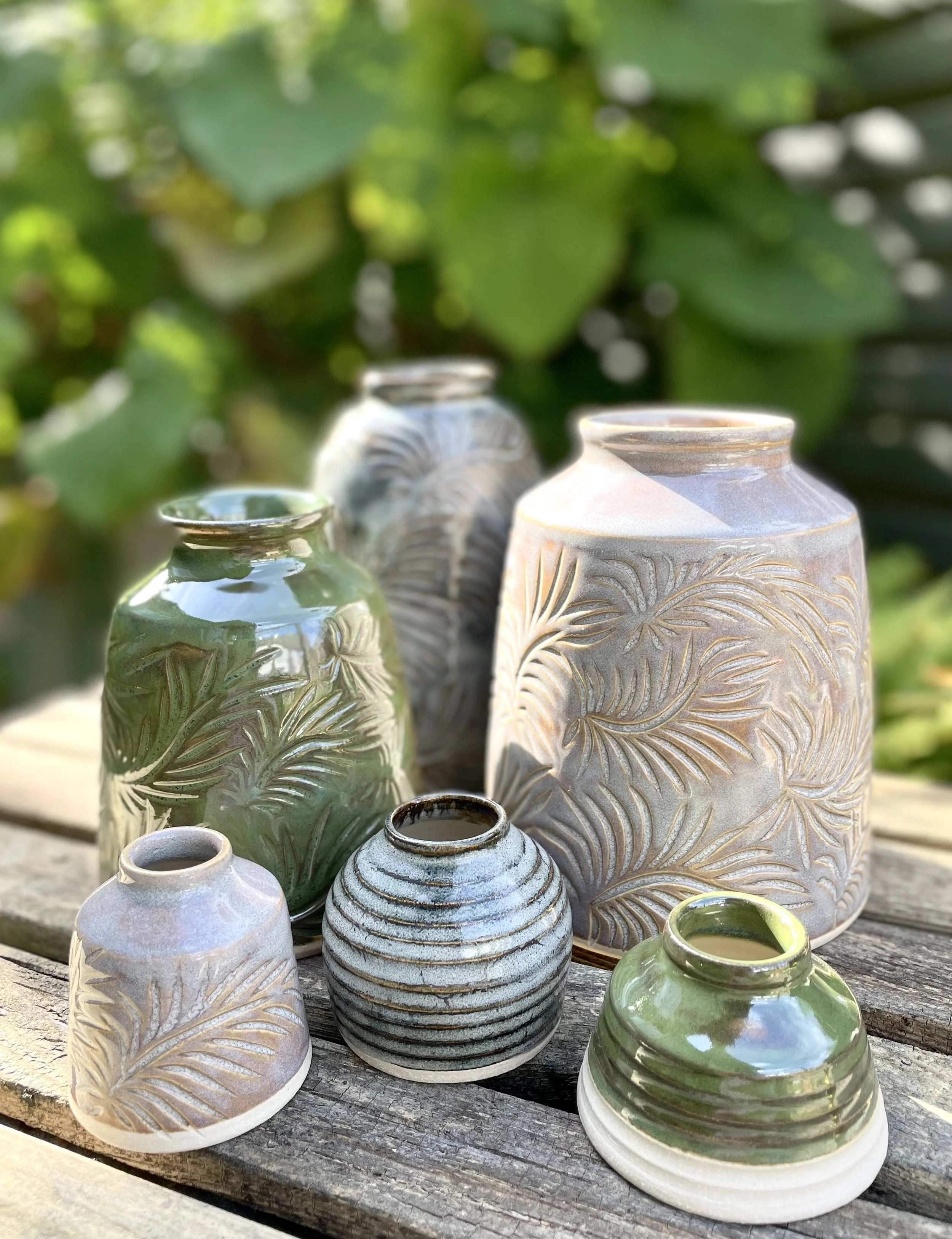 Caz is a ceramic artist based between the South Downs and the Solent. She creates small batch, wheel-thrown stoneware ceramics inspired by nature and a grounded, handmade lifestyle. With a background in graphic design and interiors, she discovered pottery through a college course and quickly fell in love with clay. Her work focuses on functional forms with a calm, organic feel—pieces made to be used and enjoyed everyday. Caz also hand-builds and decorates slab-formed ceramics featuring stylised botanical designs drawn from her own garden. A keen gardener, she draws colour inspiration from the soft, shifting tones of the seasons that surround her rural Hampshire studio.