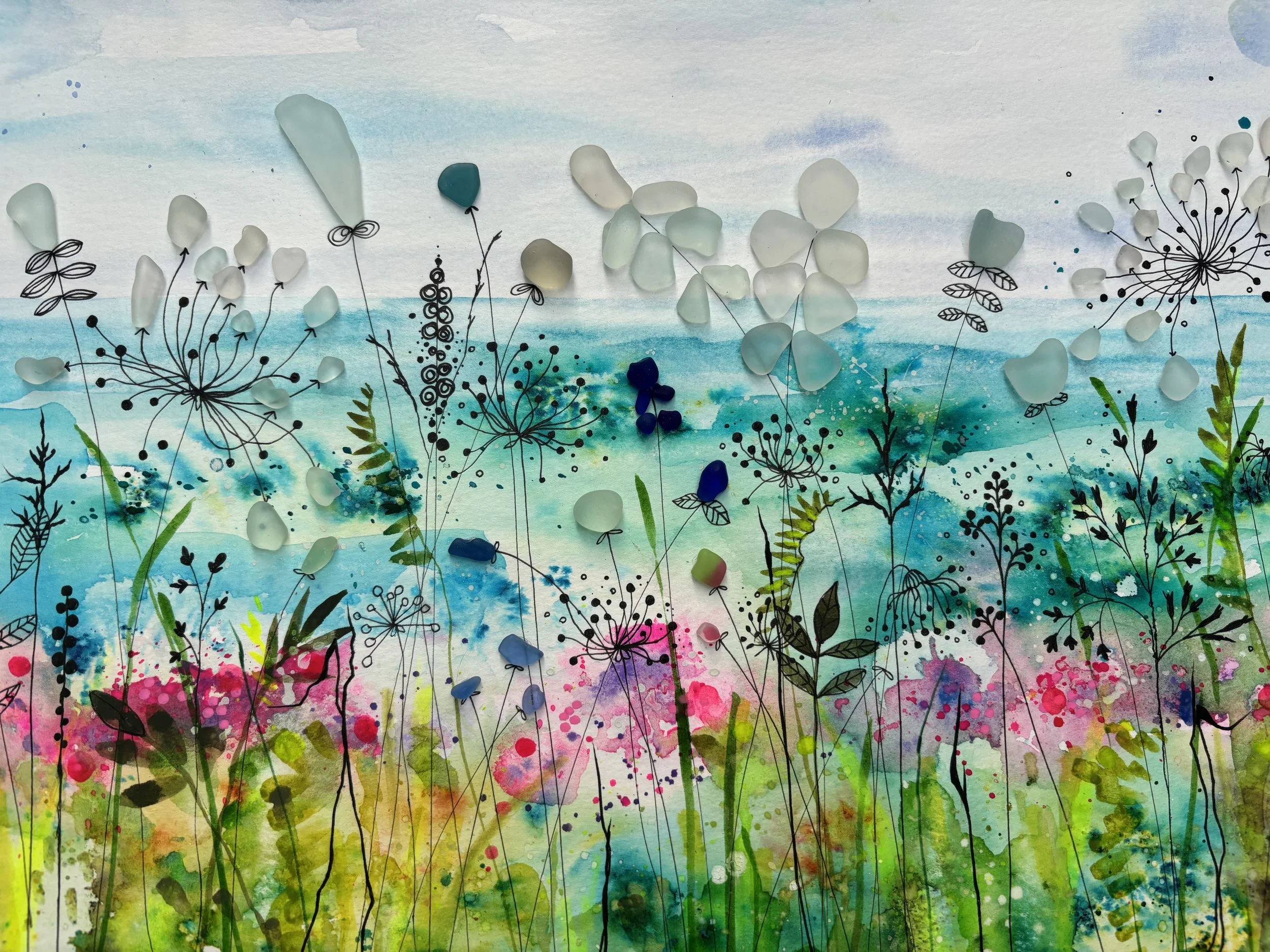 Alison Clement is a mixed media artist from Basingstoke in Hampshire. She completed a BA Hons Degree in Printed Textiles in 1983 at West Surrey College of Art and Design Farnham. In 2008 Ali’s love of arts and crafts enabled her to open a successful and busy shop in Basingstoke. In 2016 after enjoying a ‘Creative Weekender’ in St.Ives, Cornwall, her love of art was rekindled! The sea, combined with a love of beachcombing turned these passions into creating one of a kind, unique artworks. Working in mixed media, mainly Brusho, watercolour, collage and pen to build her pieces, she then applies the beautiful sea glass she has collected, adding a unique dimension to her work.