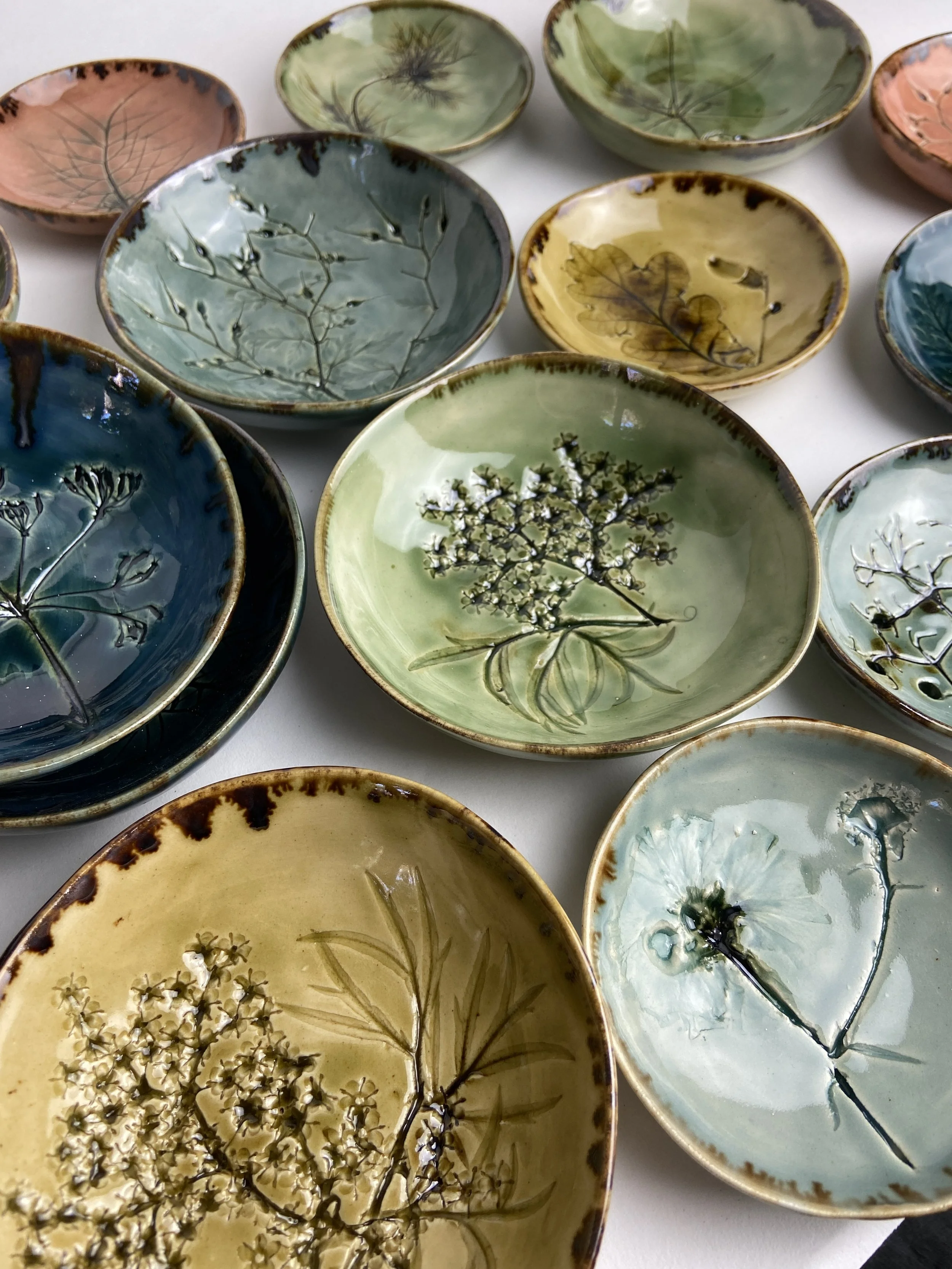 Gill Usher’s ceramics are handmade and entirely original, created using real leaves, flowers, and feathers gathered from her garden or from Epping Forest. Each impression captures delicate textures like a timeless fossil held in suspension. Glazed in jewelled, earthy tones, the pieces take on an ethereal, captured quality, ensuring no two are ever alike. Working with natural materials pressed directly into clay, she forms functional ware that is hand-painted with oxides to create a soft, watercolour-like effect. Each piece is then finished with her own handmade glazes in organic shades, resulting in thoughtful, expressive work rooted in the landscape around her.